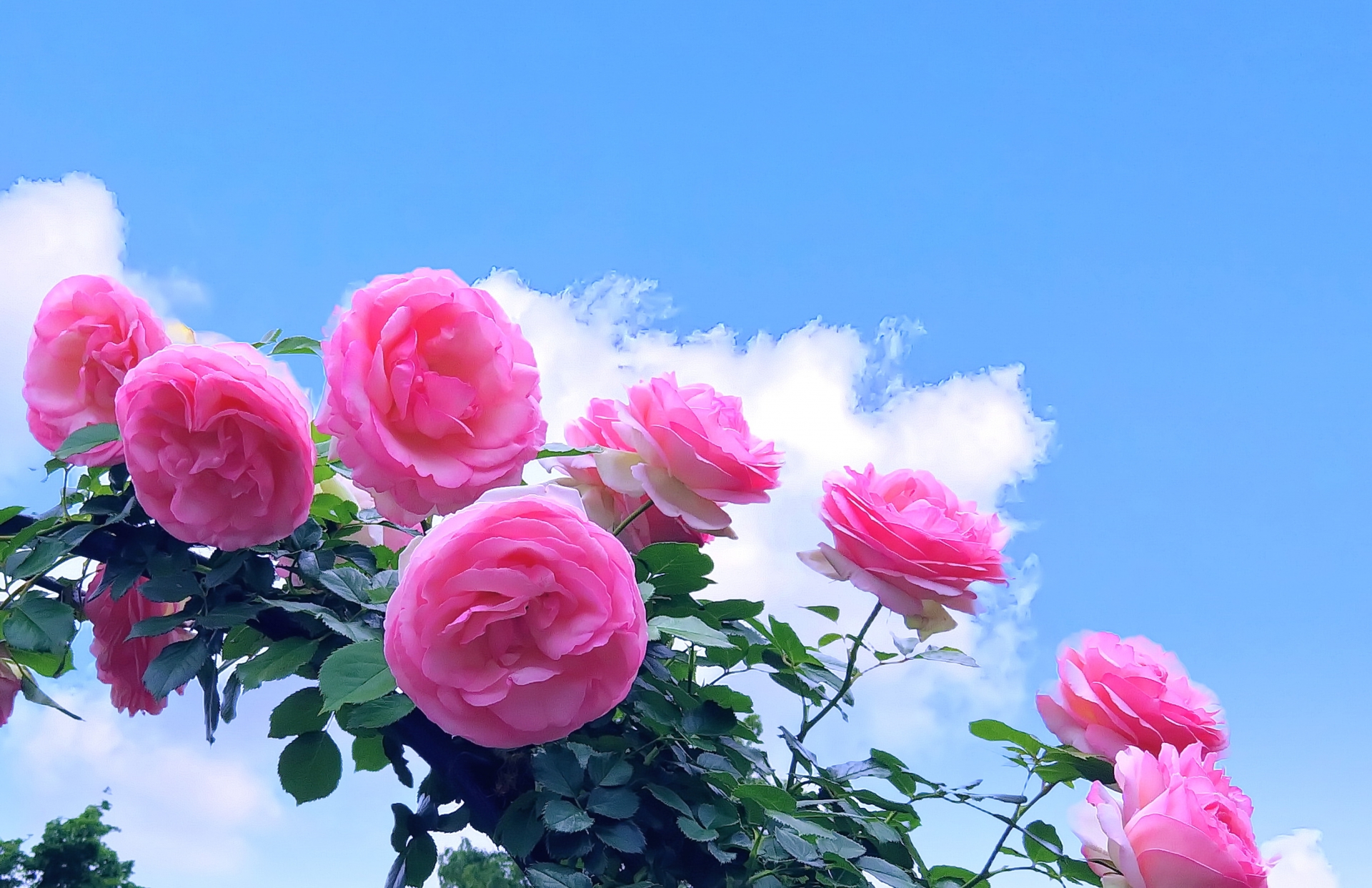 気持ちいい青空にバラの花が映え、心も晴れ晴れとしますね。